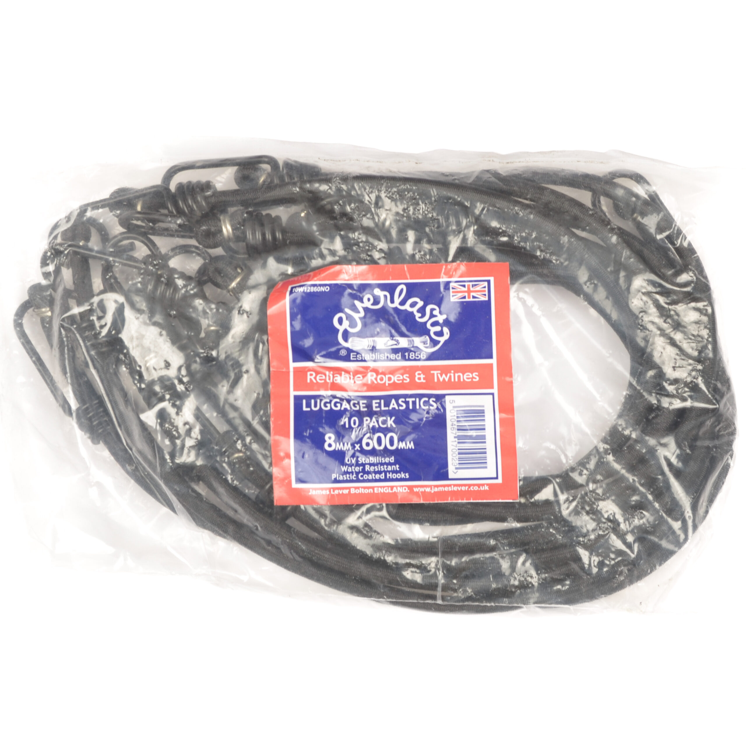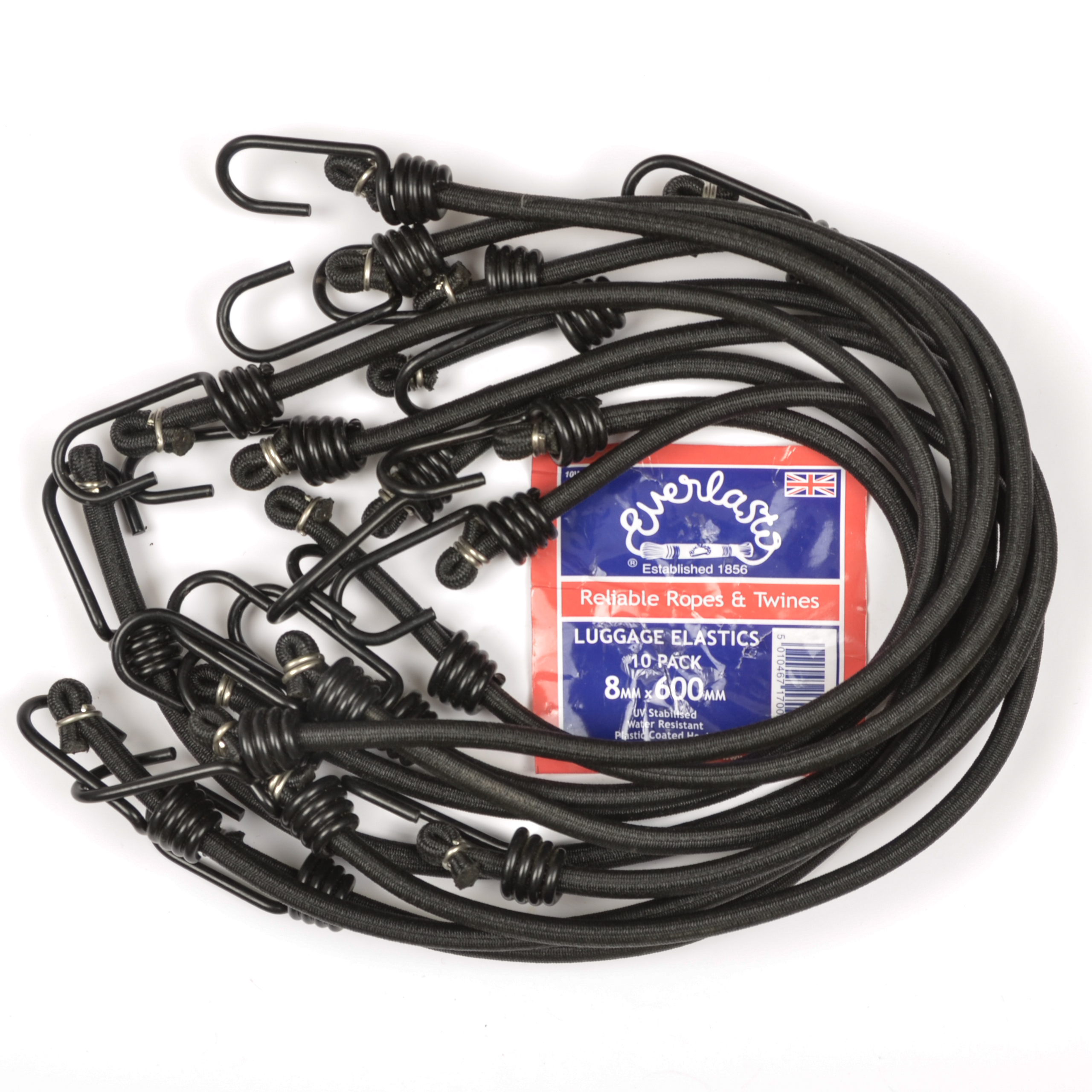 8mm x 600mm Luggage elastics complete with spiral hook ends – 10 pack.